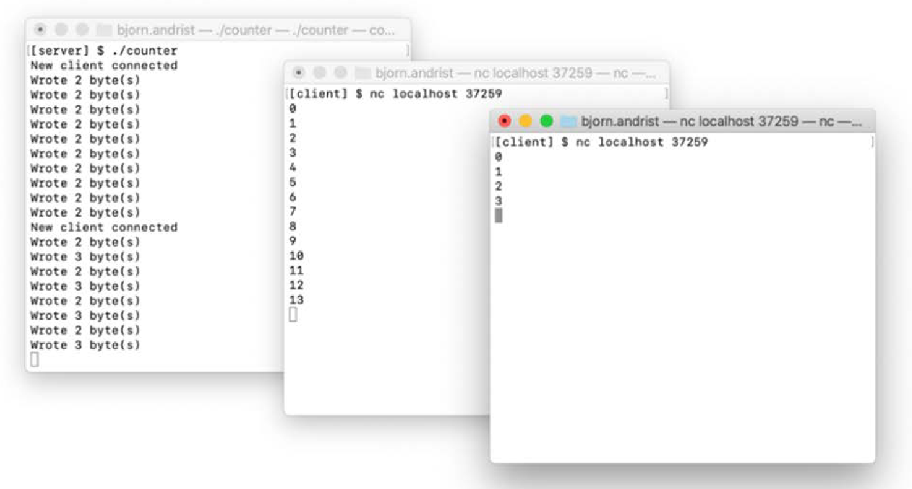 我们可以启动多个客户端,它们都将由一个专门的 serve_client() 协程调用来服务,并拥有各自递增的计数器变量副本。