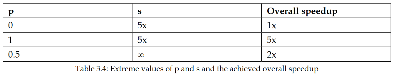 - 设置 $p = 0.5$ 且 $s = \infty$ 意味着我们完全消除了程序中占总执行时间一半的部分。那么总体加速将是 $\text{2x}$。
