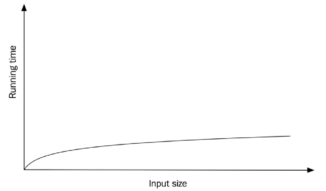 假设我们使用一个包含 64 个元素的数组调用 binary_search()。在第一次迭代中,我们排除了 32 个元素;在下一次迭代中,我们排除了 16 个元素;再下一次迭代中,我们排除了 8 个元素,依此类推,直到没有更多的元素可比较,或者直到我们找到键。对于 64 的输入规模,最多会有 7 次循环迭代。如果我们把输入规模加倍到 128 呢?由于我们在每次迭代中都将规模减半,这意味着我们只需要多一次循环迭代。显然,增长率不再是线性的——它实际上是对数增长 (logarithmic growth)。如果我们测量 binary_search() 的运行时间,我们会看到增长率看起来类似于下图: