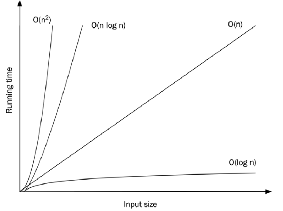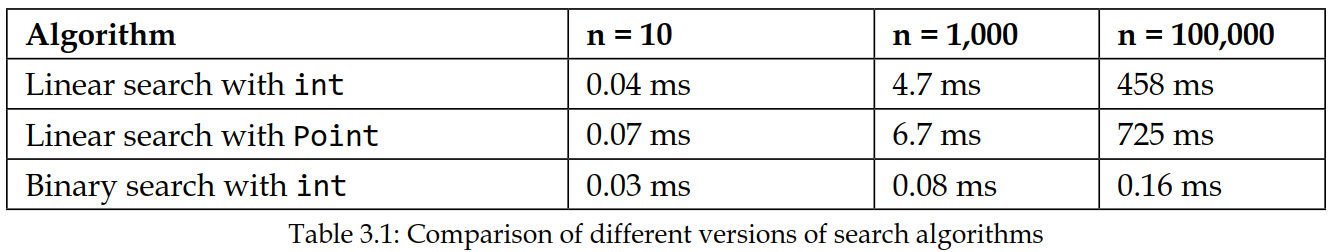 比较算法 1 和 2,我们可以看到比较点比比较整数花费更多时间,但即使输入规模增加,它们仍然处于相同的数量级。然而,当我们比较所有这三个算法在输入规模增加时的情况,真正重要的是算法所展现的增长率。通过利用数组已排序的事实,我们可以用非常少的循环迭代来实现搜索功能。对于大型数组,与线性扫描数组相比,二分搜索实际上是免费的。