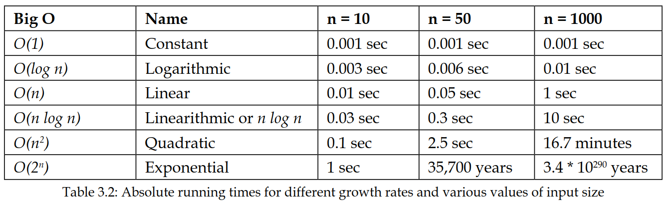 这些增长率独立于机器、编码风格等因素。当两个算法的增长率不同时,在输入规模足够大时,增长率较慢的算法将永远胜出。让我们假设执行 1 单位的工作需要 1 毫秒(ms),看看不同增长率下运行时间会发生什么变化。下表列出了增长函数、它的常用名称以及不同的输入规模 $n$: