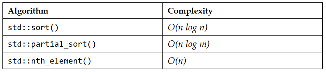 如果我们知道集合已经排序,我们可以使用二分搜索 ($\text{binary search}$) 算法之一:binary_search()、equal_range()、upper_bound() 或 lower_bound()。如果我们将这些函数用于提供随机访问 ($\text{random access}$) 的容器,则它们都保证以 $O(\log n)$ 时间运行。当我们稍后在本章讨论迭代器和范围(有一个有趣的部分名为“迭代器和范围”)时,你将更好地理解算法如何提供复杂度保证,即使它们操作的是不同的容器。