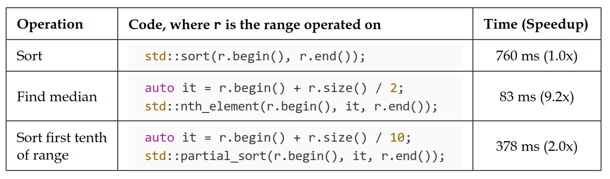 如前所述,这不是唯一的排序方法,有时我们可以使用部分排序算法 ($\text{partial sorting algorithm}$) 来提高性能。我们将在本章后面详细讨论排序。