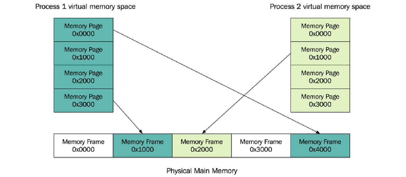 下面的图表显示了两个正在运行的进程。它们都有自己的虚拟内存空间。一些页映射到物理内存,而另一些则没有。如果进程 1 需要使用起始地址为 0x1000 的内存页中的内存,就会发生页错误。然后,该内存页将被映射到一个空闲的内存帧。另请注意,虚拟内存地址与物理地址不同。进程 1 的第一个内存页(起始虚拟地址为 0x0000)映射到一个起始物理地址为 0x4000 的内存帧: