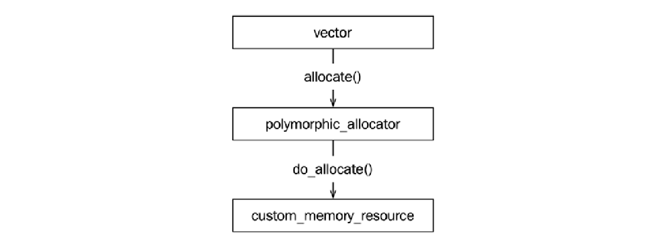 下图展示了控制流:vector 委托给它的分配器实例,而分配器又委托给它所指向的内存资源: