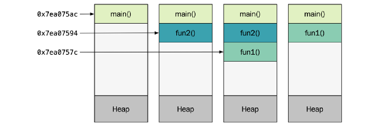下图说明了程序执行期间栈如何增长和收缩。第一个框说明了程序刚进入 main() 函数时的内存情况。第二个框显示了执行 func1() 时栈如何增加,依此类推: