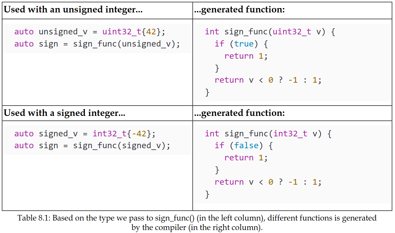 因此,在编译时,与常规函数不同,编译器将为每一组唯一的模板参数生成新的函数。这意味着它相当于手动创建了四个不同的函数,看起来像这样: