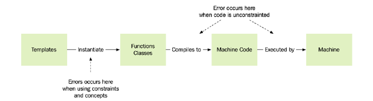 这是一个有所简化的观点;并没有规定 C++ 编译器必须以这种方式执行转换。然而,将 C++ 元编程视为在以下两个不同阶段进行是有益的: